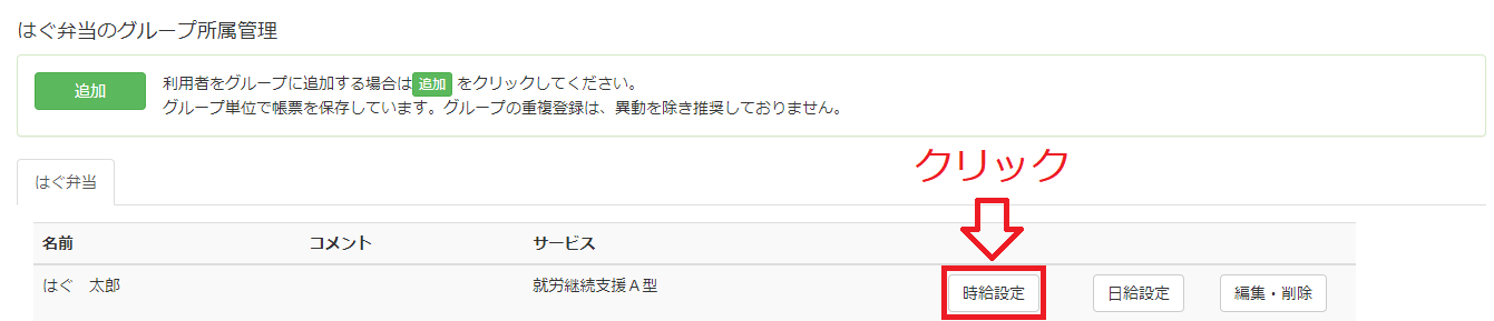 グループ所属管理 (←クリック)で、利用者一人一人の時給や、日給の個別設定が出来ます。