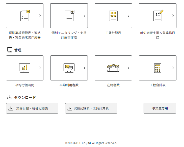 ・日々の記録、打刻の管理、業務日誌~支援計画、アセスメントシートの記録管理が出来ます。