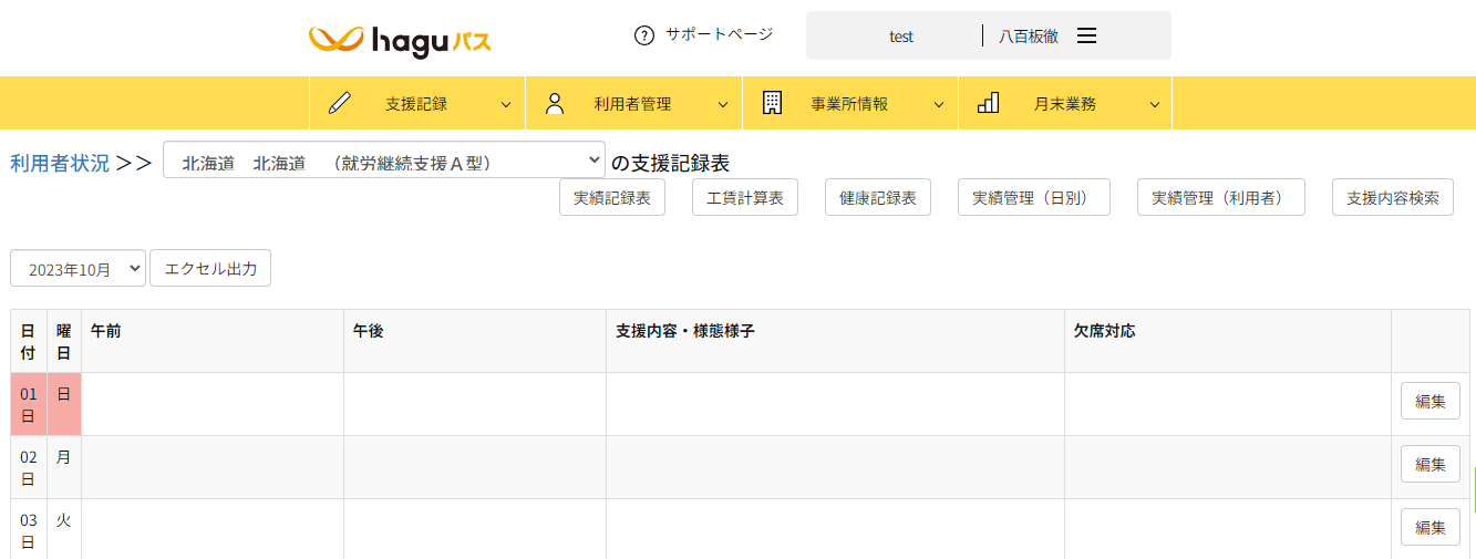 ログインTOP>利用者状況>>対象利用者さんの「支援記録表」