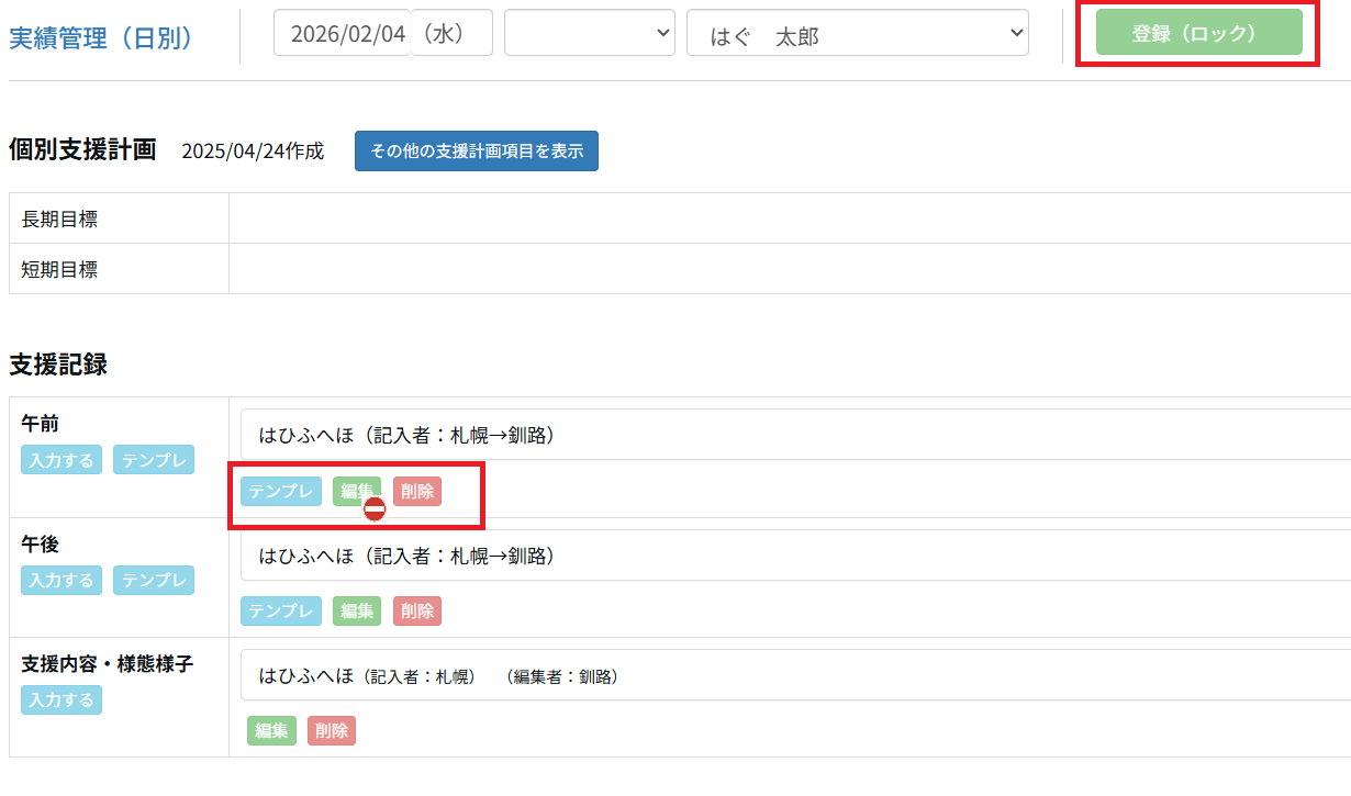 はぐパスログインTOP>>利用者状況>>対象利用者さんの「支援記録」の記録に対して、他のアカウントから編集や、逆にロックをかけて、編集が出来なないようにする機能です。