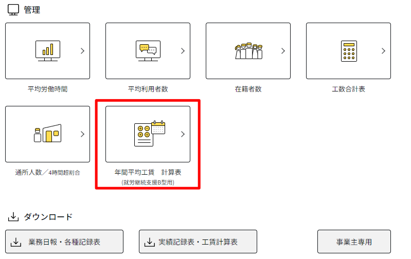 TOP画面 下部管理カテゴリから「年間平均工賃 計算表」よりアクセスできます。