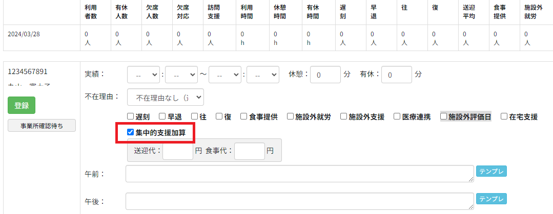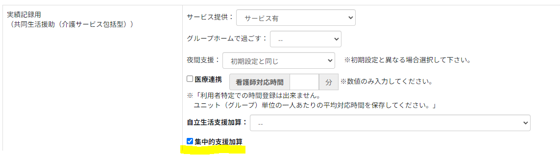 「サービス提供状況」編集画面で、「集中的支援加算 を利用する」という項目を選択して保存を行う事で、加算取得が出来ます。