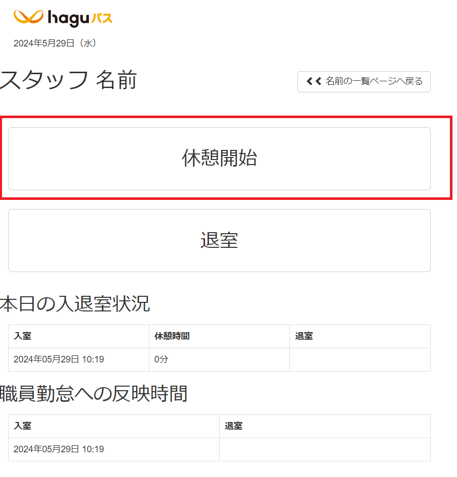 ※職員の休憩時間のデフォルト設定 + 職員用タイムカード画面の「休憩ボタン」を利用する場合