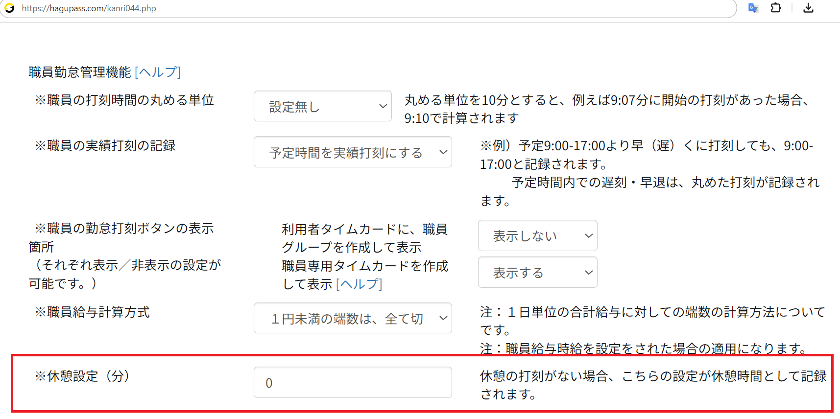 ページ内「職員勤怠管理機能」画面 ※休憩設定 に、職員出勤時に取得したい休憩時間の設定を、分数で入力して登録ください。