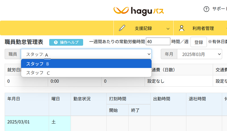 上記各ページ内の職員の並び順は、スタッフ管理のページ内の職員の並び順に連動しています。