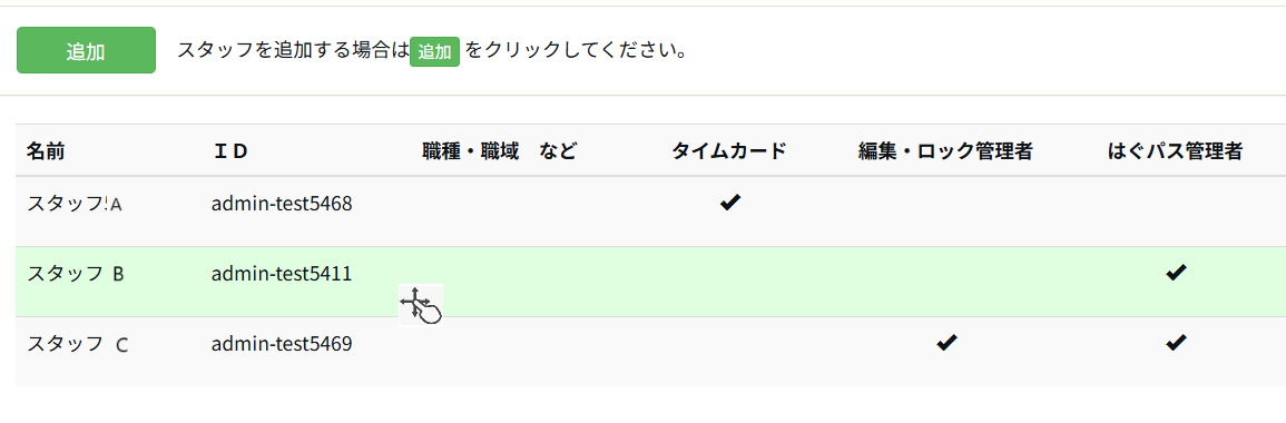 並び替えをしたい職員の名前に、カーソルを合わせると、十字矢印のマークが表示されます(以下イメージ参考)ので、その状態のまま左クリックで、つまんで上下に移動させることで、職員の並び順を、変えることができます。