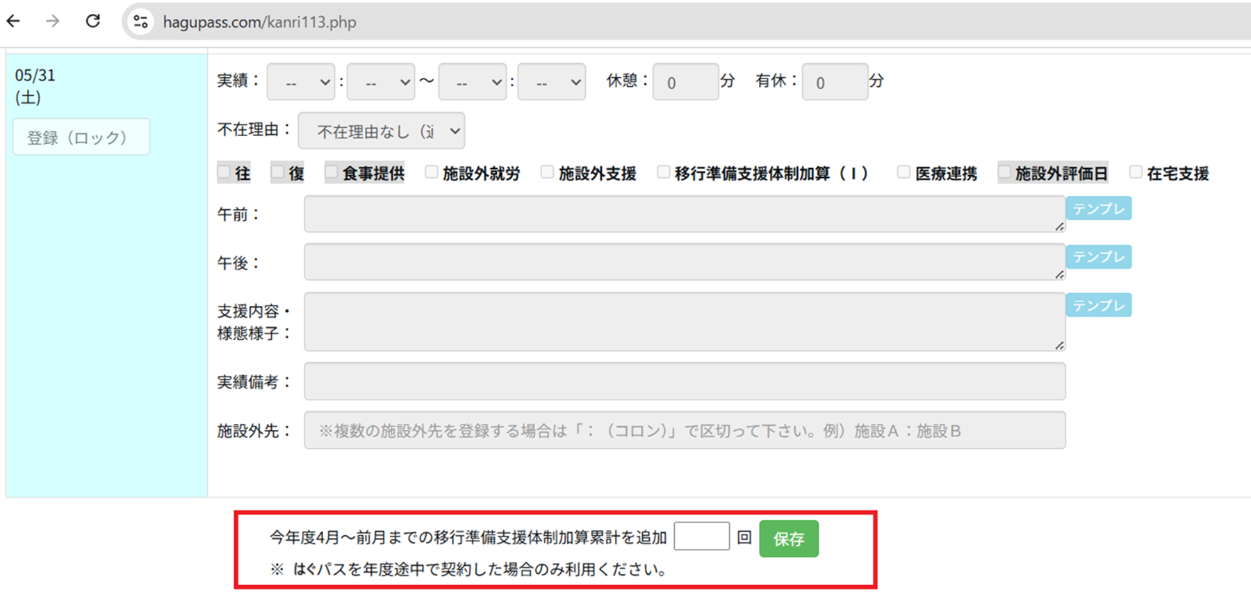 ※当月分からは、通常の支援記録ページ内にある当該加算より、取得を行ってください。